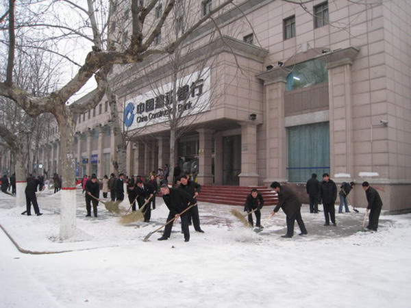 湖南省分行本部员工踊跃募捐现场。 贵州:从1月12日开始,贵州省出现了50多年来最大范围、最长时间的雪凝天气,道路湿滑结冰,境内公路封闭,接触网供电中断,导致火车停止运行,停水、断电,燃油紧缺,通讯不畅,给当地群众的生活带来不便。在这场突如其来的自然灾害面前,贵州省分行196个网点受到停电、断水和因交通中断而无法正常接送款等影响,为稳定当地金融市场的稳定,减轻灾区人民的心理压力和恐慌,贵州省分行展开了一场“保营运保安全”的保卫战。 黔东南州分行网点——该州已停电停水多日,各网点用备用发电机发电、UPS储电,在柜台上用台灯照明,坚持为客户办理业务。 贵阳网点内秩序井然——1月29日,贵州宣布全省进入大面积一级停电事件应急状态,在多家银行相继停业的状况下,建行贵州省分行绝大部分网点坚持营业,大厅内秩序井然。 抽调后台员工作大堂经理,充实一线服务队伍。 六盘水分行网点——大堂经理在湿滑的台阶上主动搀扶、迎送客户。 后台员工及时抢修发电设备。 湖北:日前,湖北省受强冷空气影响,出现了大范围的大风、降温、降雪和冰冻天气,其中武汉市遇上了30年来最强的冰冻天气。1月11日,当第一场大雪刚刚降临之时,湖北省分行就立即着手布置保障客户安全和正常营业的各项工作。从省分行到基层网点,从省分行行长到储蓄所柜员,全行上下都掀起“清扫门前雪”的热潮,扫帚、铁锹齐上阵,雪害期间建行所有营业网点门前都没有了冰雪障碍;同时在网点内加铺了草毡、防滑垫,及时修理更换了空调、取暖器等设备,保证每个来建行办理业务的客户都能进出方便、如沐春风。 1月13日第一场雪后省分行领导带领员工清扫营业大楼门前积雪。 2月3日,湖北省分行张进副行长代表省建行向湖北省民政厅备灾中心捐赠150万元善款用于省内受灾地区救助和重建工作。 安徽:连日来,罕见暴雪冰封江淮,安徽全境交通严重受阻,恶劣天气给安徽省分行部分网点正常营业和安全运营带来不利影响。为做好雨雪天气客户服务工作,分行要求各行主动组织员工及时清扫网点门前积雪,保障行路畅通,营业网点门前应铺设防滑垫,张贴醒目的防滑标识,做好客户的安全提醒工作。保卫部门要与保安押运公司联系协调,争取武装押运车辆能够提前出发,以保障营业网点按时开门营业。 合肥市钟楼支行门前,职工们铲冰除雪,忙得热火朝天。 铺上崭新的红地毯,既防止台阶打滑,又让客户过了一把“明星瘾”。“小心地滑”的温馨提示让客户内心暖意融融。 顺着干净的“雪路”,运钞车顺利驶入,柜员们准时做好班前准备。 江苏:自下雪以来,江苏省分行各级机构紧急行动,组织防雪抗灾工作,组织人员清扫网点积雪;为网点配备了防滑垫,保证客户安全;协调组织运钞及时到达网点;加强了车辆安全管理,目前该分行所有网点营业正常。江苏省分行将进一步落实好各项防雪抗灾工作,以应对更大的冰雪灾害,确保安全营运。 江苏省分行员工清扫积雪。 防滑告示、专人清扫飞雪、大堂经理前移服务…在连续的强暴雪中,江苏镇江分行防范措施及时到位,确保了客户的人身安全。图为暴风雪中,大堂经理搀扶客户上台阶。 江西:江西省57个县(市)已持续一周以上出现大范围冻雨天气,此次冰冻灾害天气,持续时间长、危害大,在当地历史上也较为罕见,也给分行员工的工作和生活带来很大影响。为解决因低温严寒带来的困难问题,确保各项业务的正常运转,防范各类事故的发生,江西分行从实际出发,积极采取生产自救,组织人员清扫道路积雪,抢修宿舍管道,安排车辆帮助员工运送饮用水,保障员工家庭的基本生活用水。为保证集体财产和员工人身安全,防止雨雪过大引起山石倒塌滚落,支行还派专人对办公楼、员工宿舍周边坡地的树木、山石进行安全巡查,发现情况上报处理,力争将危险隐患及时化解。 连续几天暴雪侵袭,路面积雪结冰。江西省分行组织机关团员青年到营业网点门前扫雪,让前来办理业务的客户有一个安全的通道。 庐山支行员工冒雪清扫积雪。 庐山支行门前因大雪被压断的电线和树木。 2月2日,由于受冻雨和暴雪袭击,江西省抚州市全市停电停水,抚州市分行积极组织抗灾,并购置发电机组向所属10个县和8个城区网点配送,保证业务正常开展。图为市分行机关工作人员为网点配送、安装发电机。 河南:面对50年来最大的一次降雪,河南省分行始终把客户放在第一位,从小处着手,做好客户服务工作。各网点持续坚持门前铲雪除冰,并在所有网点铺设草垫和地毯,防止客户滑倒摔伤;安排专门维修快速反应小分队,保证网点空调等取暖设施正常运转,为客户提供温暖的服务环境;同时与电信供应商加强联系和沟通,做好电子渠道售后服务,保证各电子渠道稳定畅通。 把行徽擦亮。 信阳分行员工齐战大雪。 河南省濮阳分行在雪灾中积极行动,清理积雪,以方便客户办理业务。 广西:地处南方的广西桂林全州县支行所在区域遭遇多年未遇的雨雪灾害,导致交通全线封闭,电力连续中断,但桂林分行及时采取防范补给相关措施,急送备用发电机组和油料保证了县支行网点的正常营业及运作。 广西桂林全州县支行员工在严寒中清理网点大门,全力应对雪灾对营业带来的不利影响。 厦门:连日的雨雪导致多趟火车停运,滞留厦门的旅客多达8000人。大雪无情,建行
