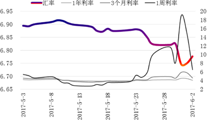 离岸人民币市场:上周,因流动性持续紧张,离岸人民币延续了前一周的强势,CNH一度涨破6.73,离岸与在岸价差一度达600个基点。周四开始,因流动性紧张得到缓解,离岸人民币汇率和资金成本均有所回落。预计本周CNH将继续维持强势震荡的局面。
