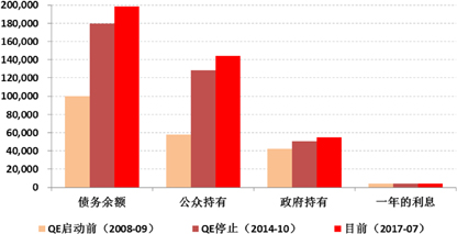 ③截止2017年8月底,美国联邦债务余额进一步升至约19.8万亿美元,其中公众持有14.3万亿美元,政府持有5.5万亿美元,一年的利息支出约4530亿美元。
