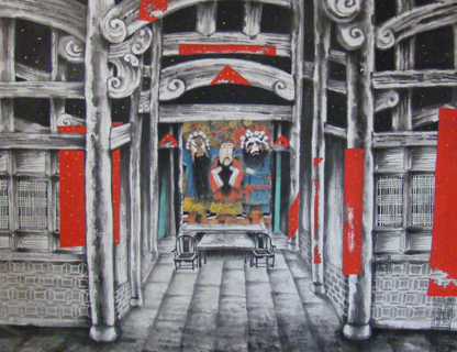 孩童时的记忆与积蓄,使郑展山萌发了“老屋”系列创作。在他看来,老屋的门其实是空间的转换器,是人造空间和自然空间的节点,而这个空间,既是物质的、现实的,又是精神的、心理的。人们可以透过“门”去看老屋内外的景观,对老屋题材情有独钟,或许是荔城潺潺不息的西溪河道、傍水而建的望族老屋以及奶奶传颂的家族史和他内心的某种意绪相连,亦或是高高翘起的屋檐、斑驳苍老的梁柱以及如火跳跃的红对联唤起他心灵深处的某种情思……对于老屋,郑展山有着很多思考和感悟。十几年前,郑展山就以老屋的“门”为主体,开始了“老屋”系列作品创作,从表面上看,他是在画老家的房子,其实是在画一种回忆,画那份长久萦绕在心中、无法挥舍的怀旧情愫。