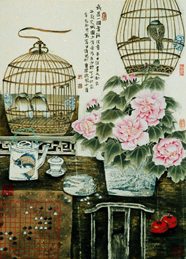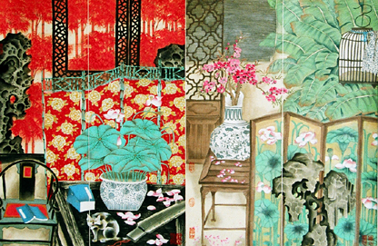 选择的基础意象组合项本身意味深长:深深庭院,高拱模梁,重叠屏风,通幽曲径,宁静舒雅,妙不可言;其画面青砖、画栋、雕窗、花格、古香古色,令人惊叹。老屋的结构已经化为平面构成符号,尤其是《老屋》作品中的一扇扇门,亦是一扇扇心灵之窗,不同的人会看到不同的风景。当然,作品的“门”并非千篇一律,细看之下,它们开合有大有小,并不对称。有些景色从门外进来了,穿过门与墙,飘浮在空中,使观者产生身处其中或其外的错觉和疑问,产生对现实与理想的追问。有些景色从门里出来,线装书、花瓶、屏风、古琴、红木家具,太湖石、荷花、帘框等,透露出画家对古代文人墨客书斋生活的向往,它们与其说是一种题材,不如说是一种象征。展山注重的是画面梁柱的穿插,分割与形式感,并没给人以压力,反而增加了画面的节奏感,门的色彩,也因主题不同而有着明暗与颜色的变化。