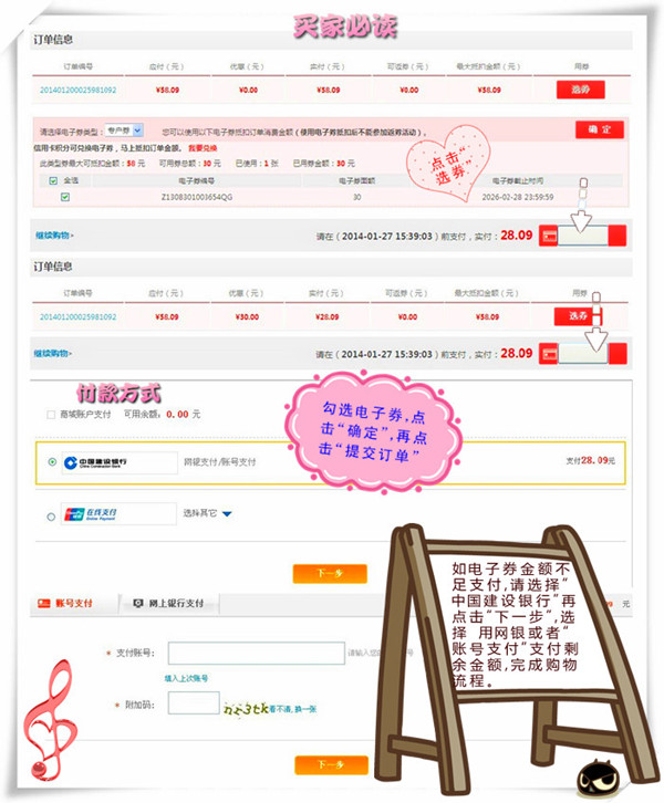 下面是选购商品成功后,使用电子券完成订单支付的流程: