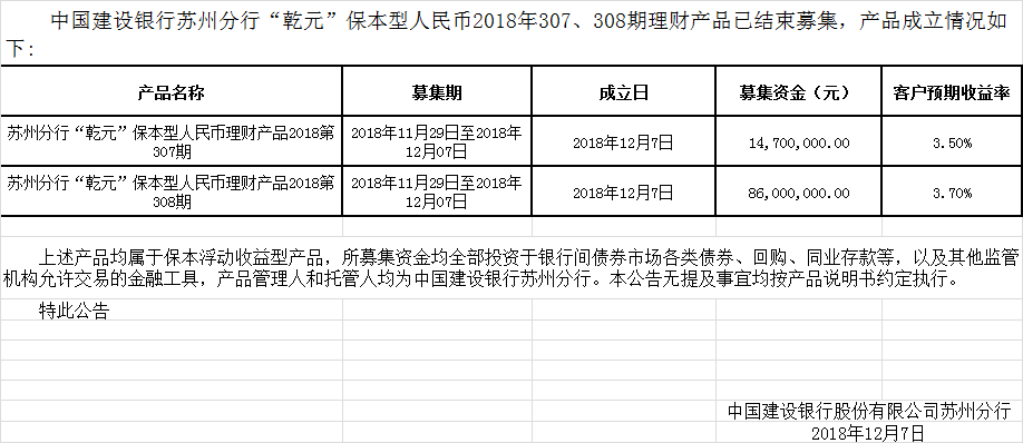 中国建设银行苏州分行“乾元”保本型人民币2018年307、308期 理财产品成立公告